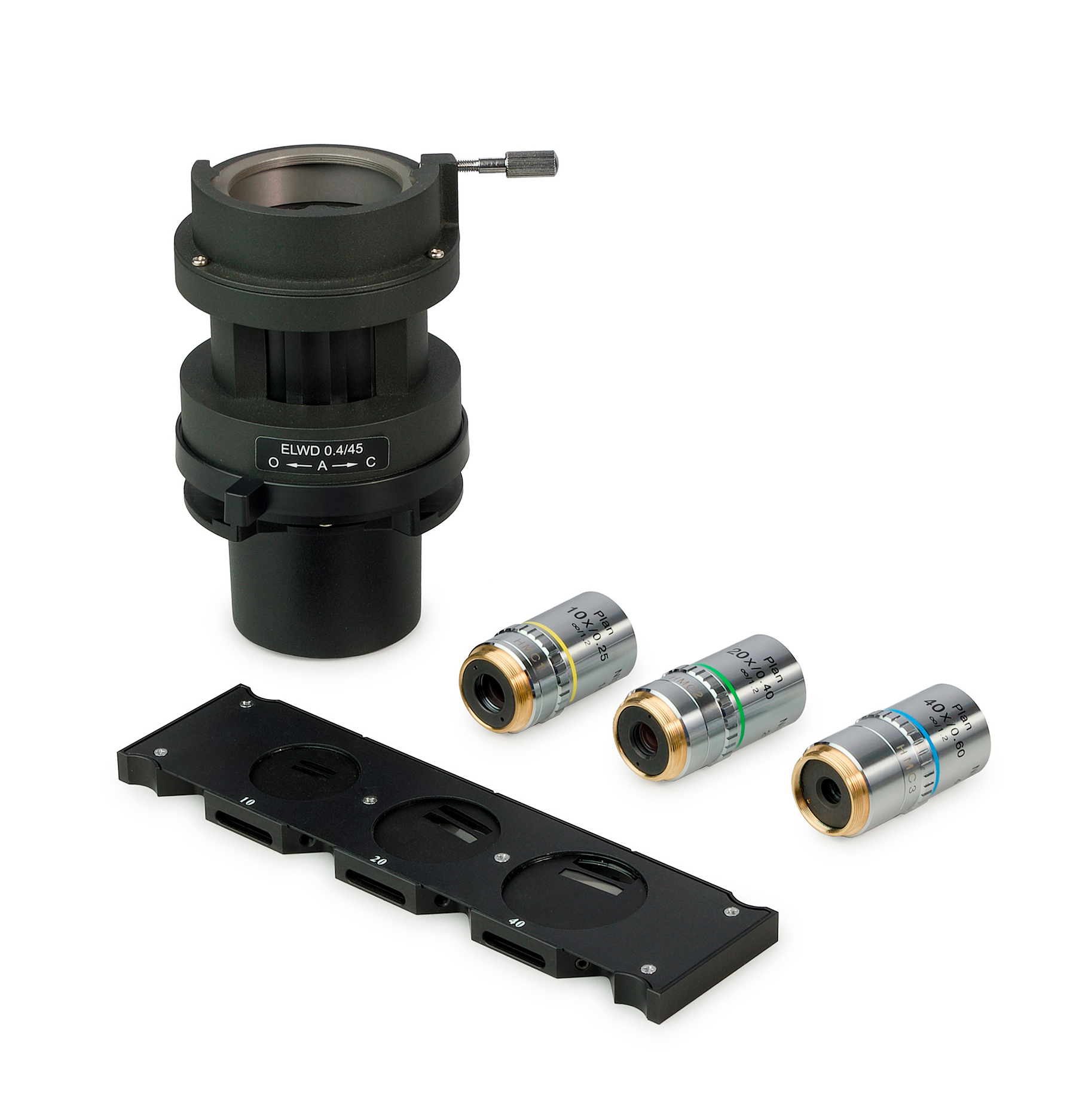 Do mikroskopu odwróconego. Zawartość zestawu: zestaw obiektywów planarno-achromatycznych, kondensor i suwak