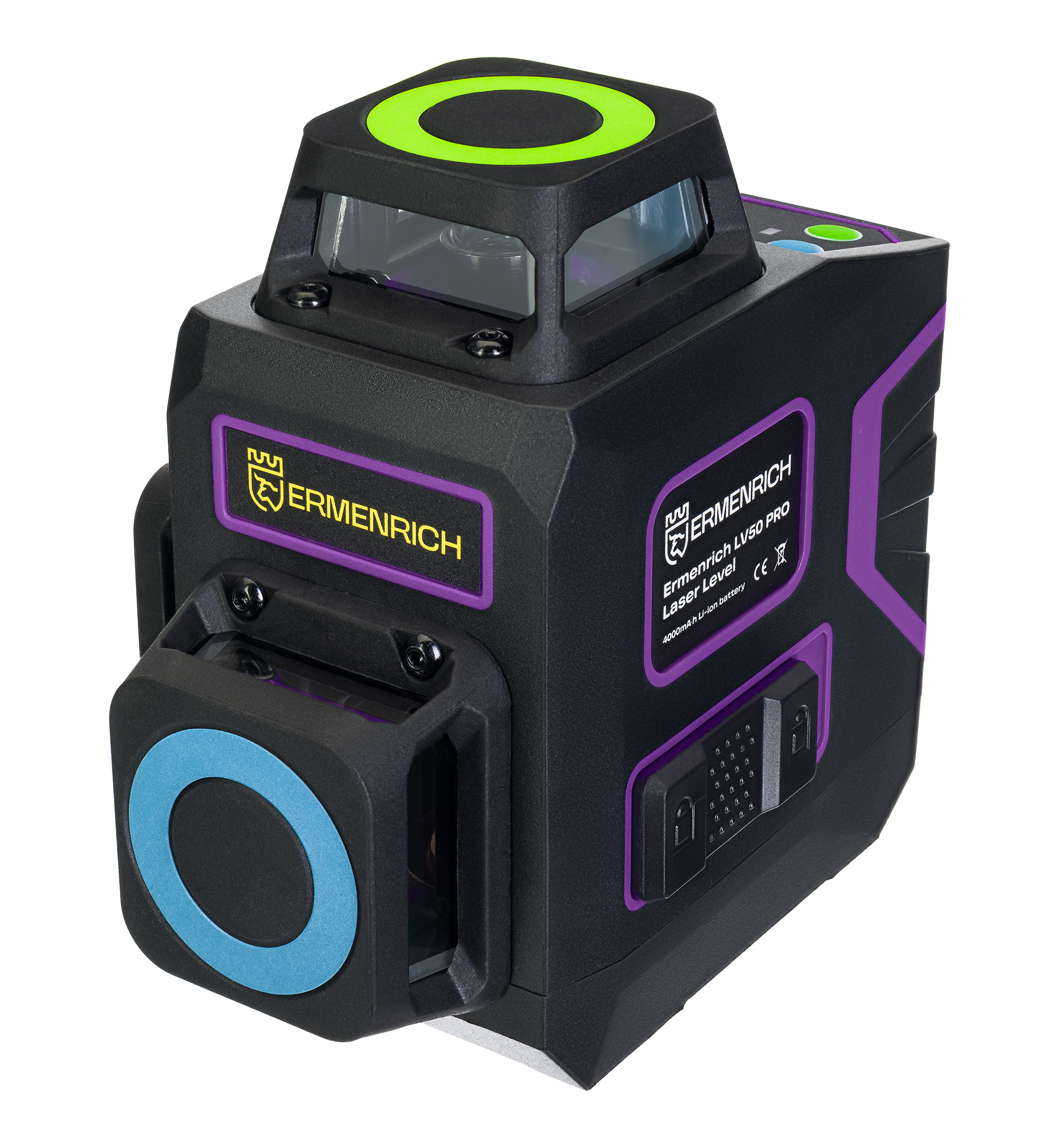 Poziomica laserowa Ermenrich PRO LV50 jest wyposażona w kompensator ograniczający drgania, a tym samym automatycznie wyrównujący płaszczyznę lasera. Aby uzyskać najwyższy poziom dokładności, można użyć dołączonej do zestawu płytki celowniczej (odbiornika wiązki lasera). Wbudowana bateria litowa gwarantuje długi czas pracy, natomiast pilot jest zasilany standardowymi bateriami. Dostępne są cztery poziomy jasności lasera, co ułatwia wybranie optymalnego ustawienia do danych warunków oświetleniowych. Poziomicę laserową opracowano z myślą o szerokiej gamie temperatur roboczych – nawet poniżej zera. Jest ona również odporna na pył i zachlapania.